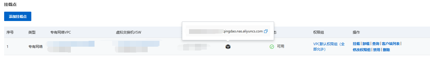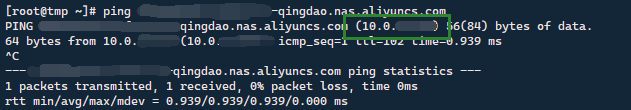 - 由于阿里云不提供挂载点的 ip,需在 nas 同区域内创建一台 ecs,通过 ping 命令获取其 ip