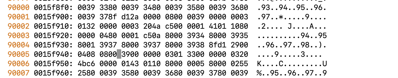 - vim 内转成十六进制编辑,转成十六进制文件内容大概如下