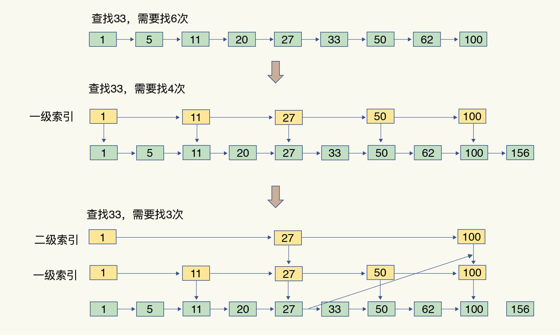 - 如果还想再快,可以再增加二级索引:从一级索引中,再抽取部分元素作为二级索引。例如,从一级索引中抽取 1、27、100 作为二级索引,二级索引指向一级索引